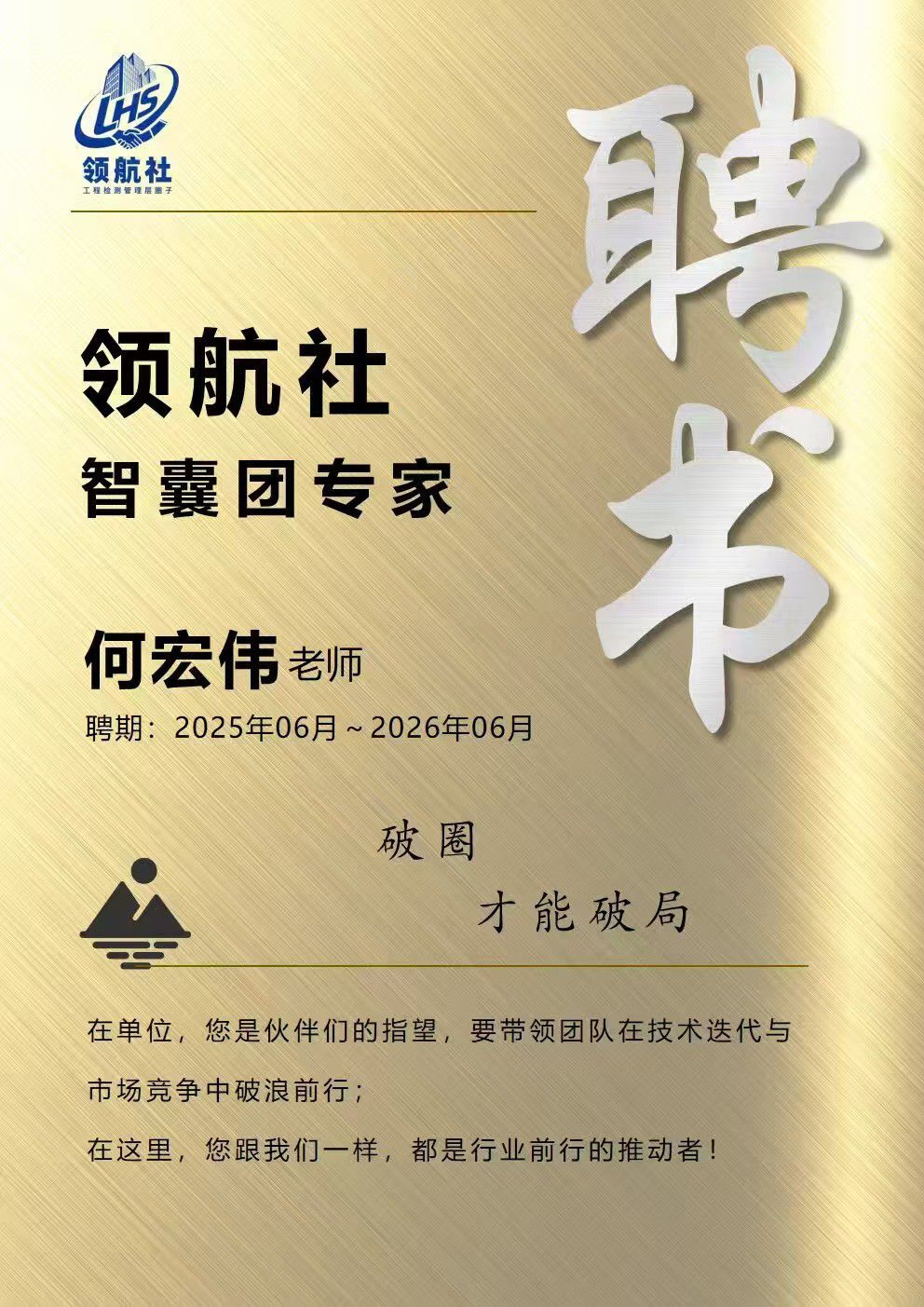 成立儀式上,中巖培訓為領航社首屆“智囊團”舉行了莊重的專家聘任儀式。公司總經(jīng)理何宏偉先生因其在工程質量檢測領域四十余年的豐富實踐經(jīng)驗、對行業(yè)痛點的深刻理解以及在企業(yè)管理與技術革新方面的杰出成就,獲得高度認可,被特聘為首批“智囊團專家”,聘期自即日起為期一年。