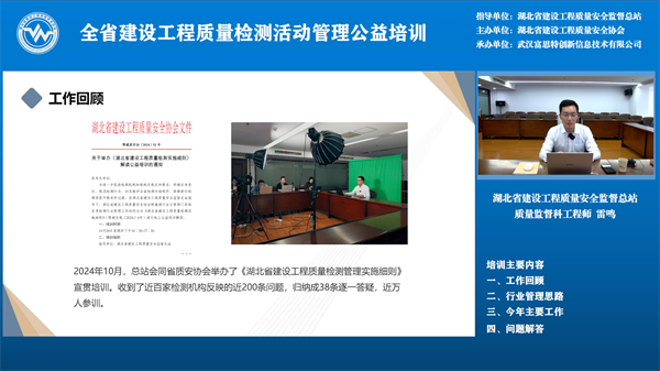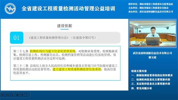 5月29日下午2:30,線上公益培訓(xùn)開始,武漢富思特創(chuàng)新信息技術(shù)有限公司總經(jīng)理謝玉超對新版湖北省建設(shè)工程質(zhì)量檢測監(jiān)管系統(tǒng)功能進(jìn)行詳細(xì)介紹,新版湖北省建設(shè)工程質(zhì)量檢測監(jiān)管系統(tǒng)運(yùn)用數(shù)字化手段和AI技術(shù),實(shí)現(xiàn)對檢測資質(zhì)和檢測活動的動態(tài)化、精準(zhǔn)化監(jiān)管,構(gòu)建了待辦中心、預(yù)警中心、決策中心三大核心功能模塊,實(shí)時監(jiān)測異常情況,并向監(jiān)管部門推送預(yù)警信息,助力各級監(jiān)管人員高效履職。系統(tǒng)還創(chuàng)新引入信用監(jiān)管機(jī)制,結(jié)合檢測機(jī)構(gòu)及從業(yè)人員的信用評價,實(shí)施差異化監(jiān)管,推動行業(yè)自律。 省質(zhì)安總站質(zhì)監(jiān)科工程師雷鳴對湖北省建設(shè)工程質(zhì)量檢測行業(yè)管理工作進(jìn)行了回顧,介紹了以后一段時期要開展的主要工作及工作思路,比如:落實(shí)分類監(jiān)管、對墻體保溫材料整治與住建部住宅工程常見問題重點(diǎn)整治、修訂地標(biāo)《房屋市政工程質(zhì)量檢測項(xiàng)目分類規(guī)范》,通過提高市場行為、技術(shù)行為從而提高行業(yè)管理標(biāo)準(zhǔn)化水平、探索數(shù)智賦能和開展行業(yè)調(diào)研等工作,最后,對前期征集的大家關(guān)注的特別是新舊資質(zhì)過渡期間存在的相關(guān)問題進(jìn)行答疑,并呼吁檢測機(jī)構(gòu)堅(jiān)持初心,切實(shí)履行好為工程質(zhì)量保駕護(hù)航的使命。 這次培訓(xùn)對于全省監(jiān)督機(jī)構(gòu)、檢測機(jī)構(gòu)平穩(wěn)完成新舊資質(zhì)過渡、規(guī)范檢測行為、在新資質(zhì)標(biāo)準(zhǔn)下推動行業(yè)發(fā)展具有很強(qiáng)的指導(dǎo)作用。全省建設(shè)工程質(zhì)量監(jiān)督人員、檢測機(jī)構(gòu)相關(guān)人員計(jì) 7600人參加了本次培訓(xùn)。 此次培訓(xùn)由武漢富思特創(chuàng)新信息技術(shù)有限公司承辦。
